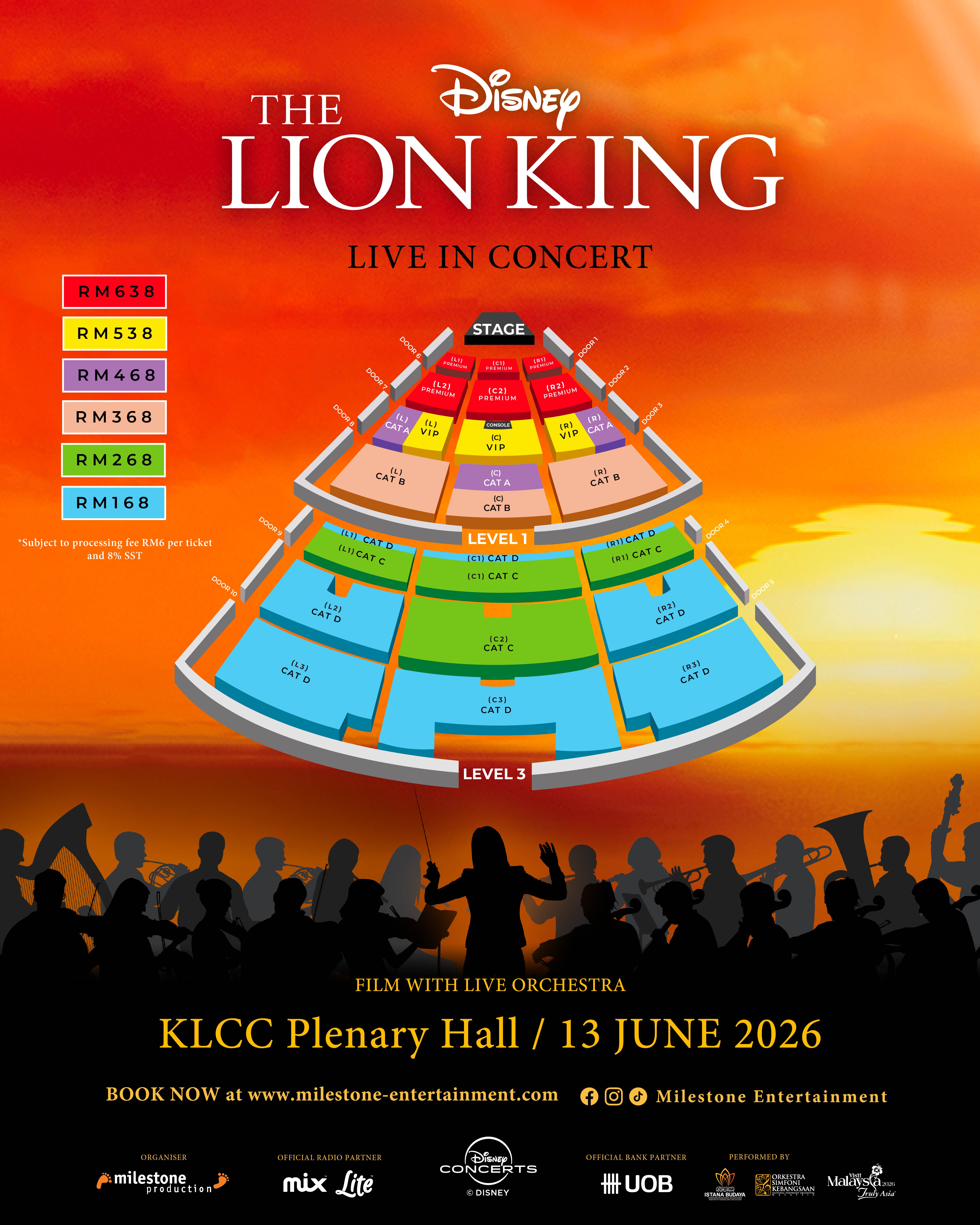 Milestone Production proudly presents, experiencing the enchantment of Disney's animated masterpiece, The Lion King (1994)! Join us for Malaysia's First-Ever Disney's "The Lion King" Live in Concert in Kuala Lumpur, featuring the beloved Oscar®-winning score by Hans Zimmer, along with the iconic Oscar®-winning songs by Elton John and Tim Rice, while the film plays on a big screen, brought to life by the National Symphony Orchestra (NSO) Malaysia under the baton of its Resident Conductor, Mr. Eric Lee.